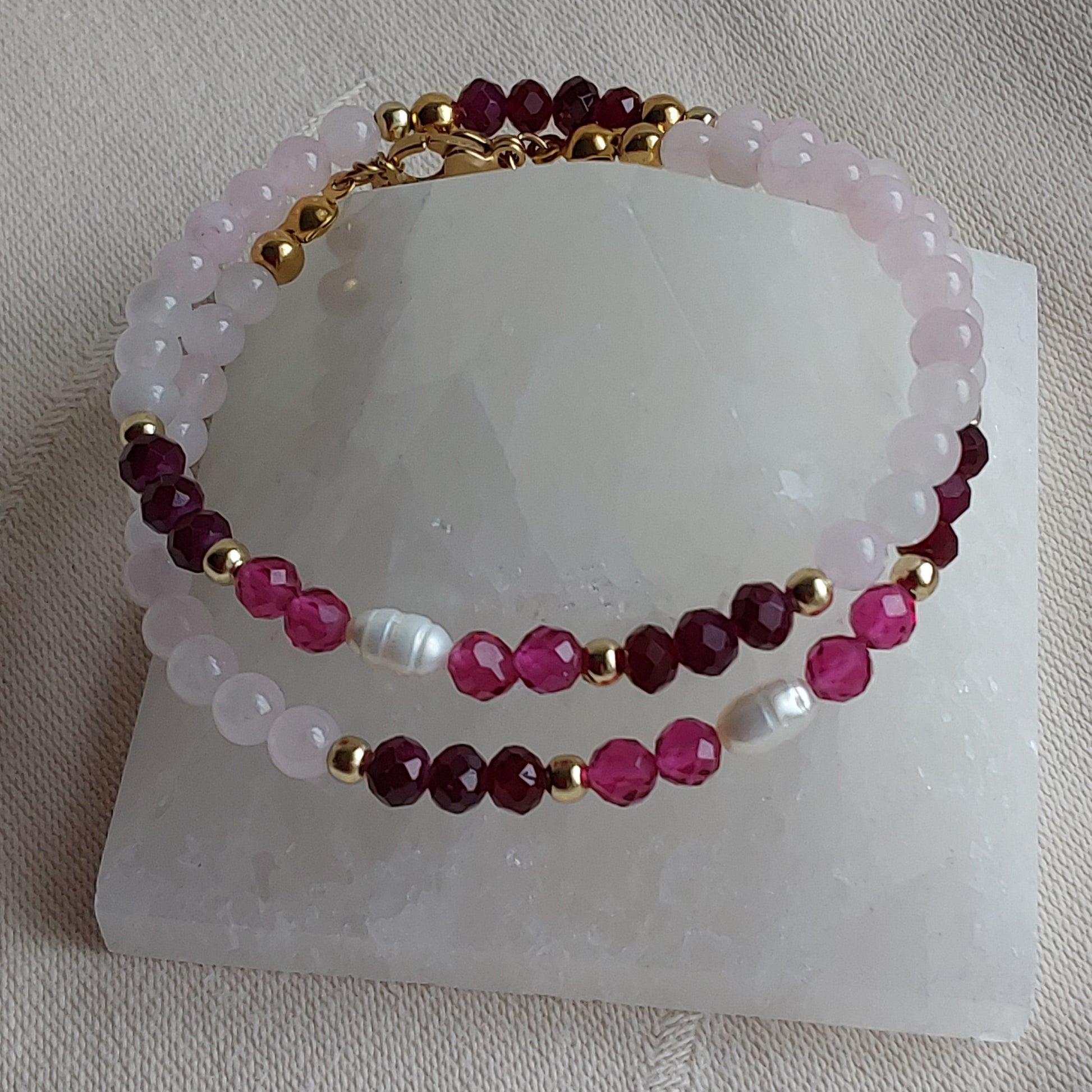L’alliance du quartz rose et des perles d’eau douce crée un flux d’énergie douce et apaisante pour le cœur et les émotions.